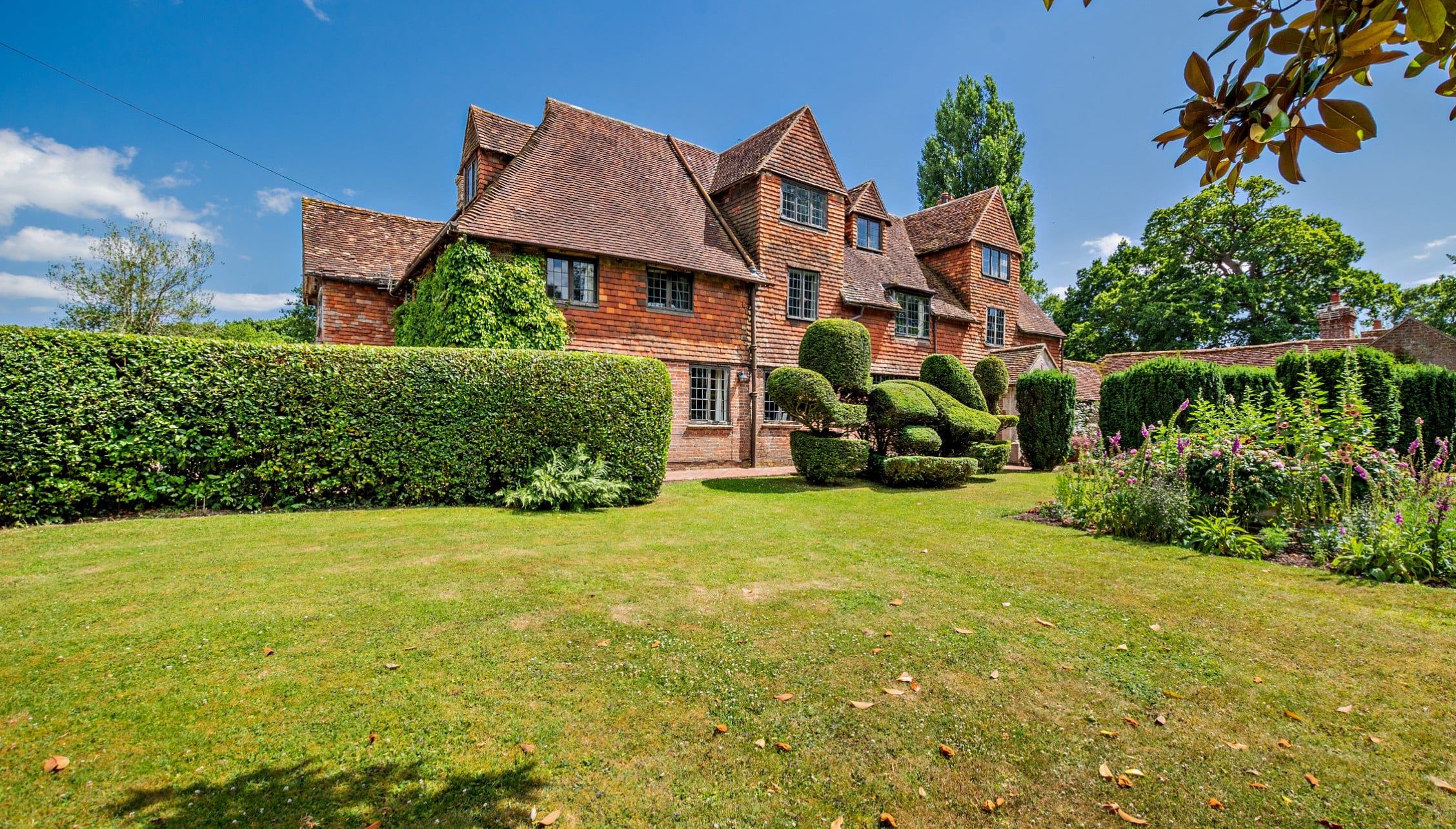A 14th-century manor in East Sussex with oak beams, wood-panelled rooms, topiary gardens, indoor pool, hot tub, games room & tennis court.